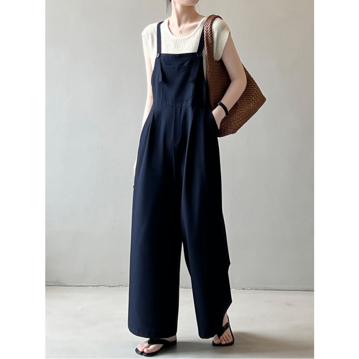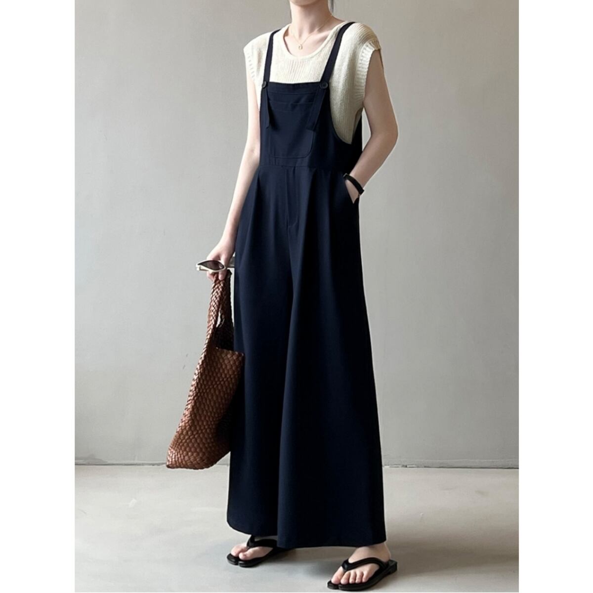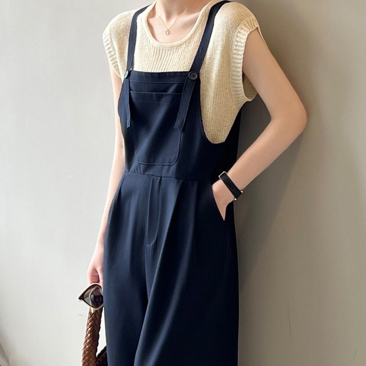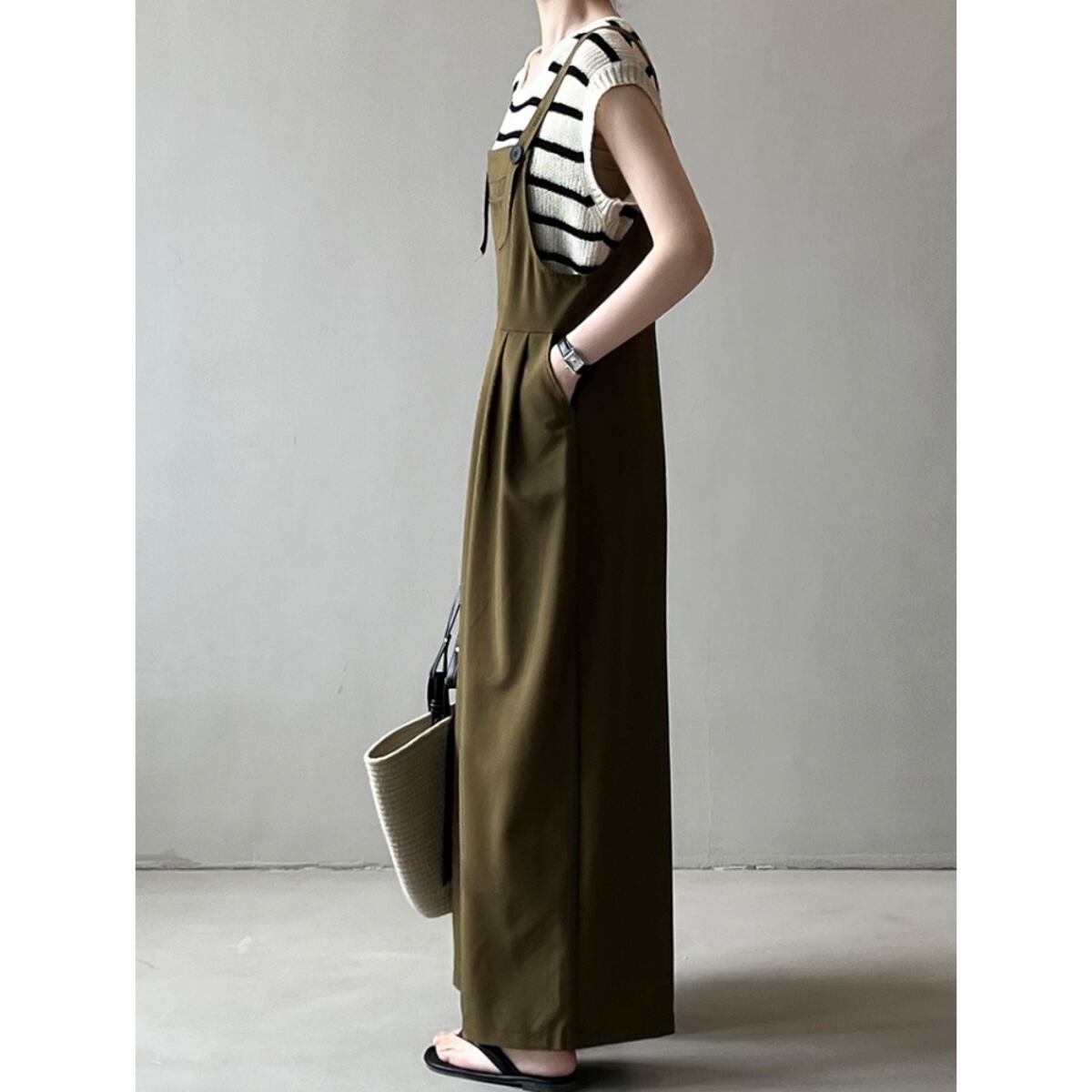 ざっくりとした風合いが涼しげなワイドタイプのサロペットです。
