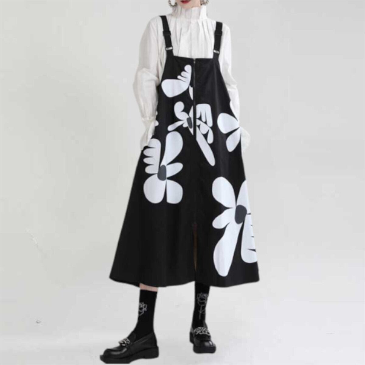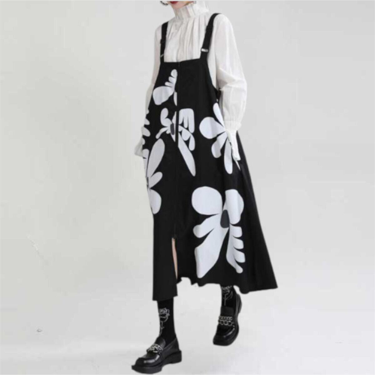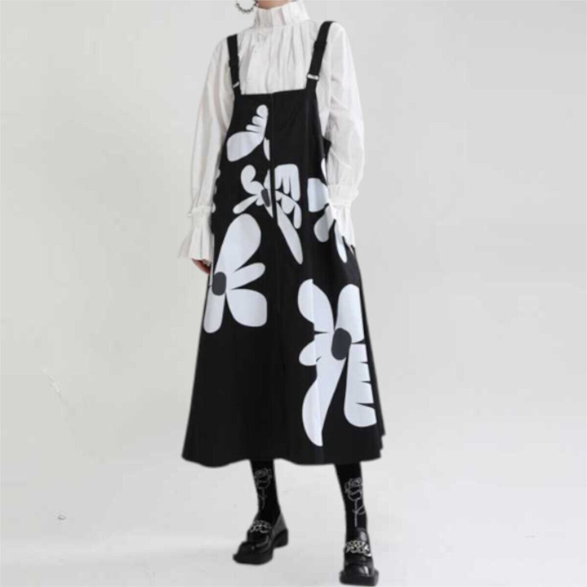 レディス ジャンパースカート フラワープリント ルーズウエスト ロングサスペンダースカート