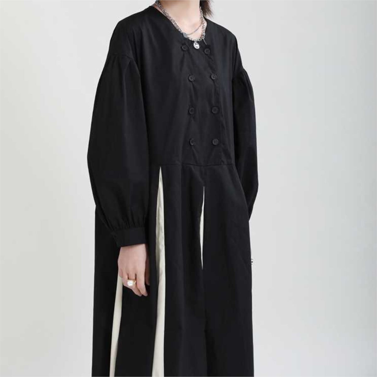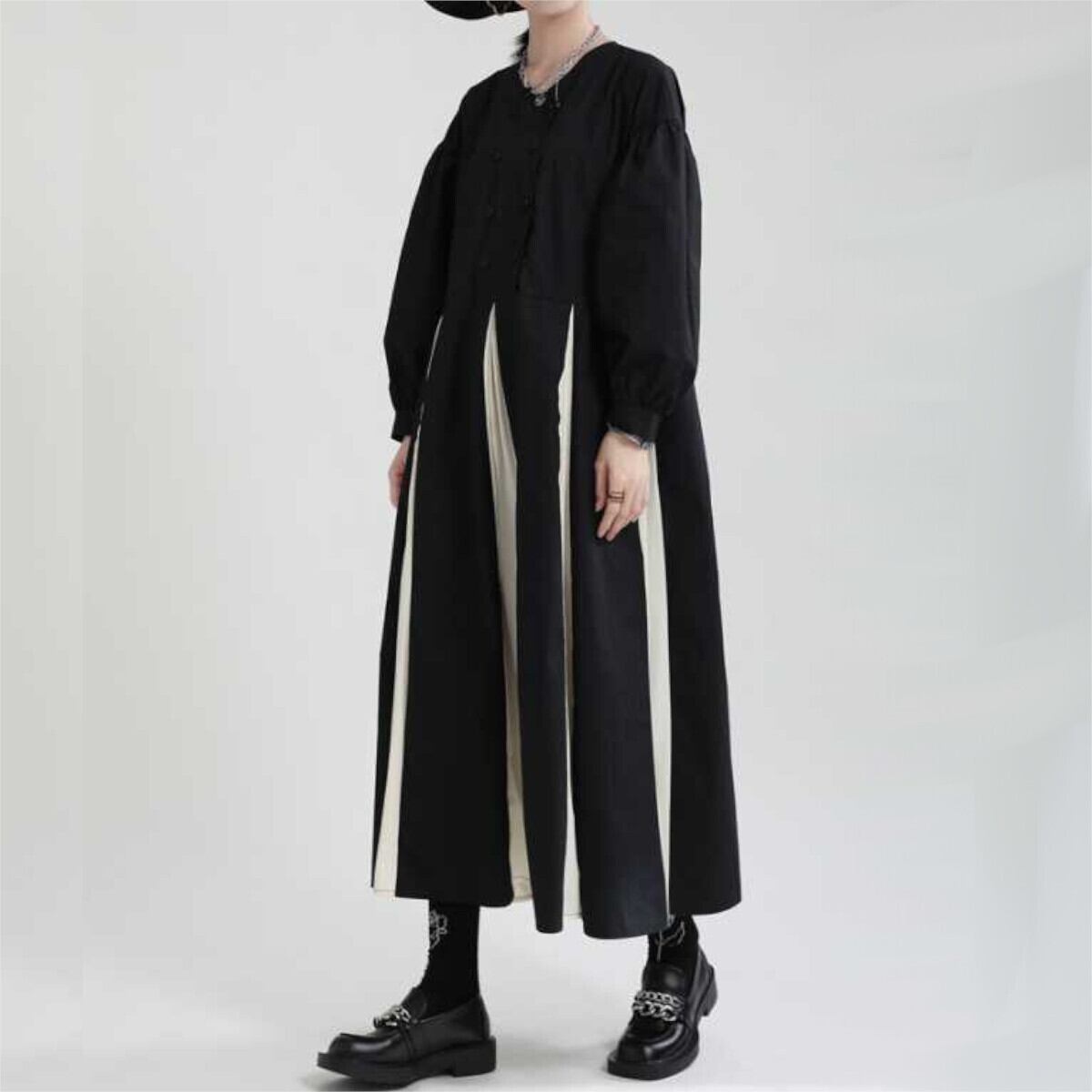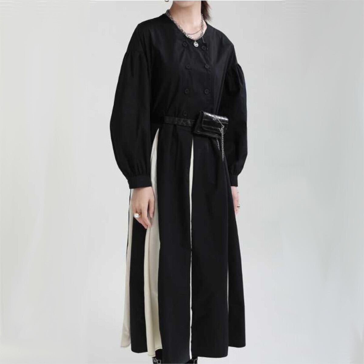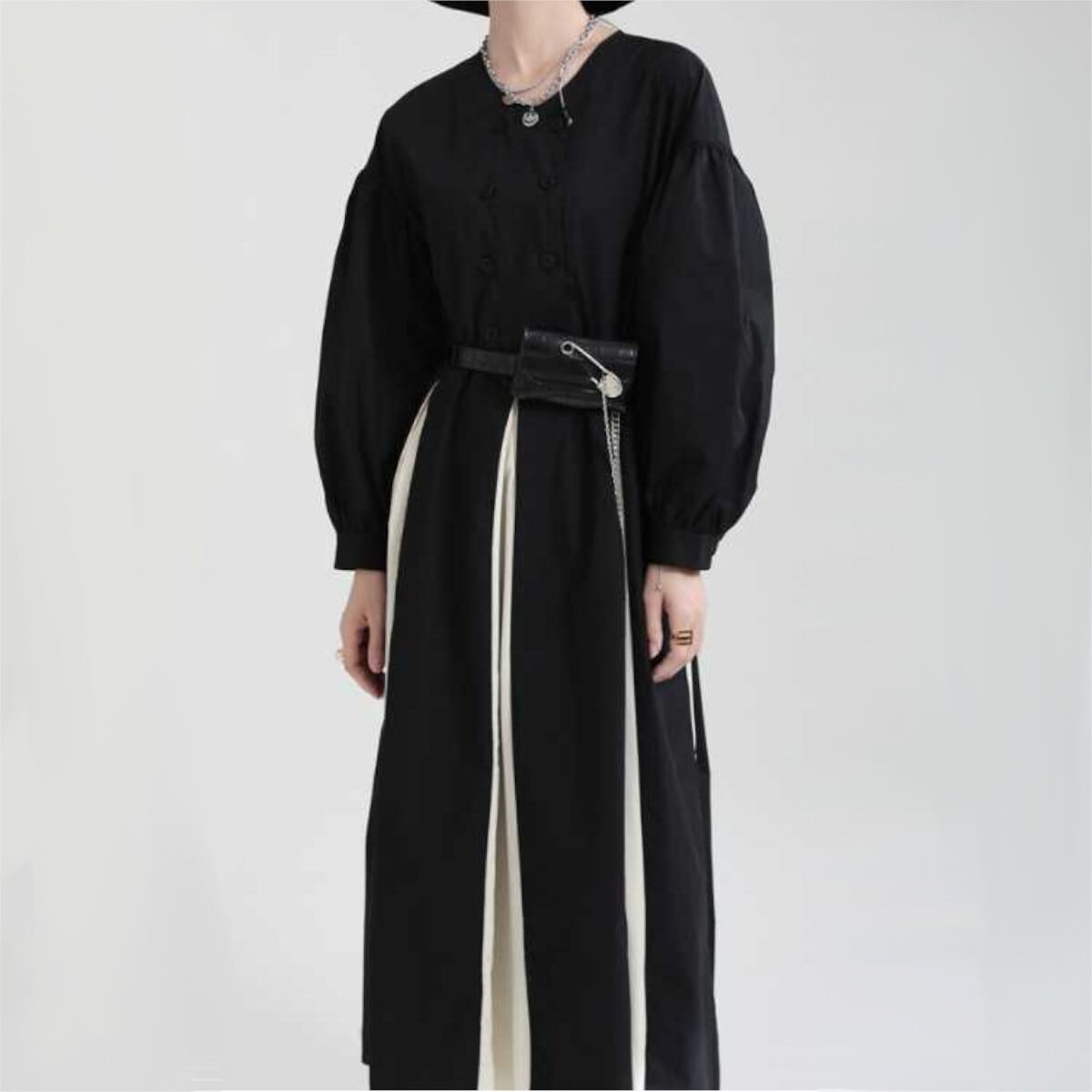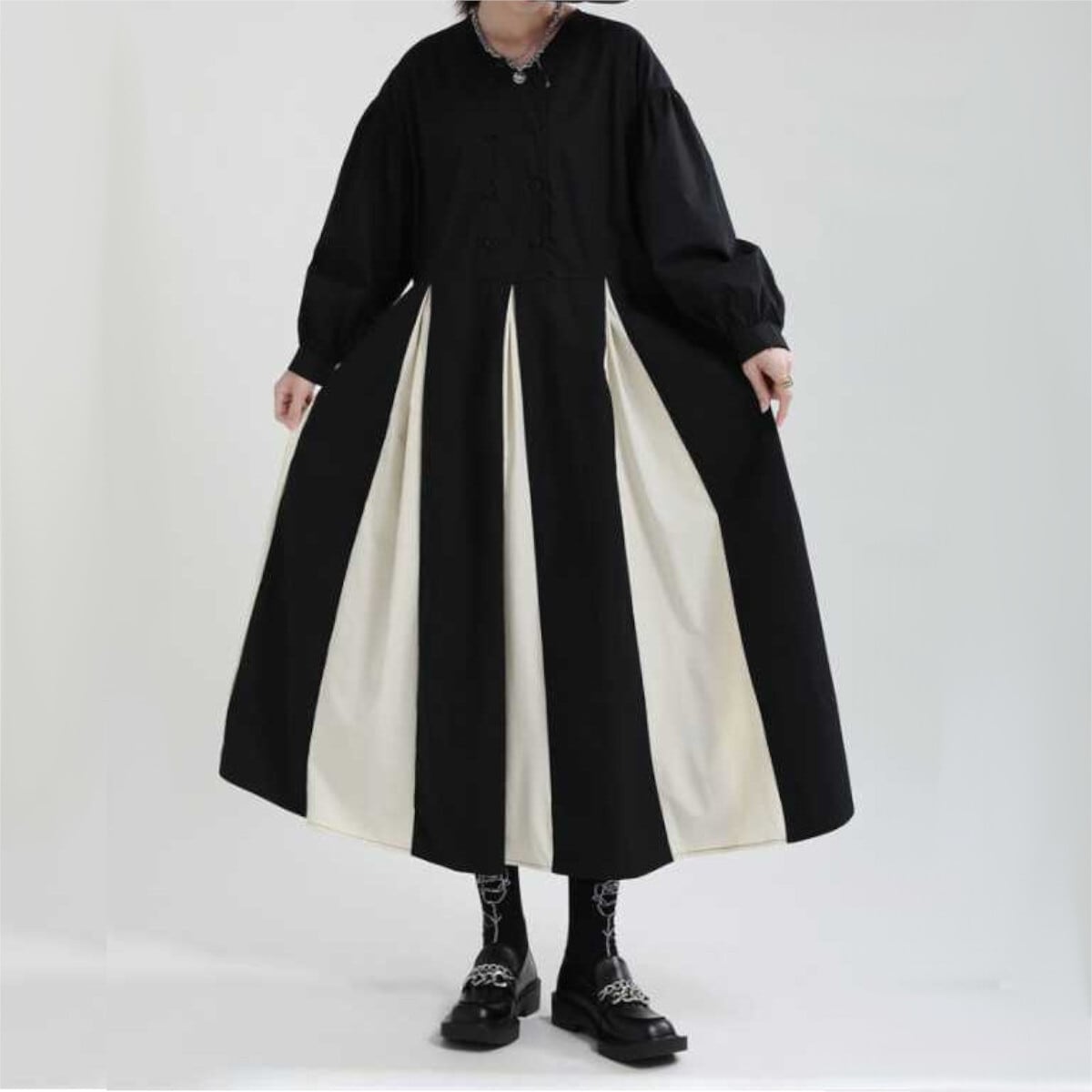 レディースワンピース パフスリーブ バイカラー切り替え フレアスカートワンピース ロングスカートドレス