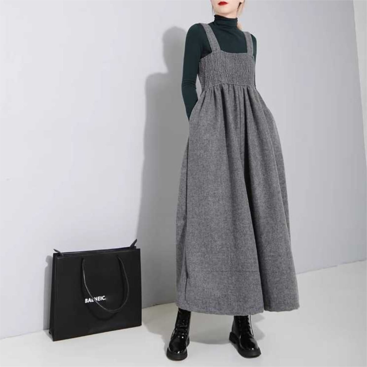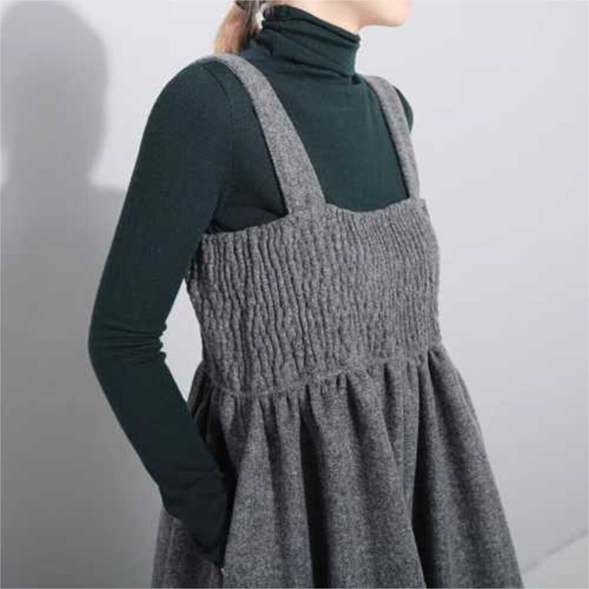 サロペットパンツのデザインにウール素材を使用し、優れた保温性と高級感を兼ね備えています。