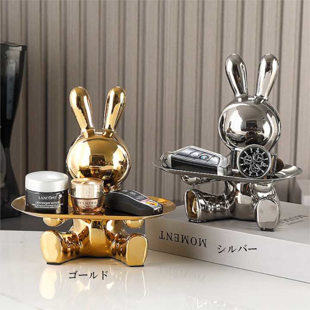 ウサギのキー収納トレイ 玄関テーブル用 ウサギの像 キャンディディッシュ オフィスデスク用 小物入れ アート ホームデコレーション